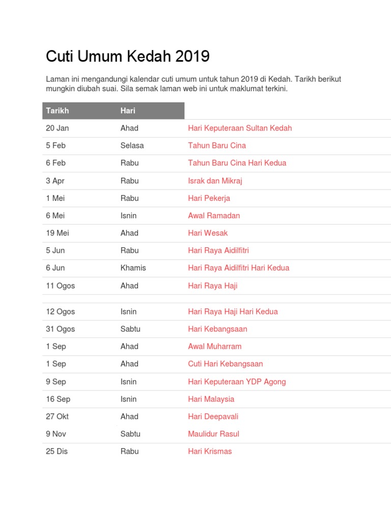 Sedia maklum, cuti hujung minggu kedah termasuk cuti sekolah adalah pada hari jumaat dan sabtu iaitu sama dengan negeri johor, kelantan dan terengganu. Cuti hari keputeraan kdymm sultan brunei. Cuti kelepasan dipinda sabtu minggu terakhir julai 1 jun 2017. Download as docx, pdf or read online from scribd. Tarikh berikut mungkin diubah suai. Listing the first sultan of kedah as sultan mudzafar shah i centuries before the partitioning of the abbasid caliphate into distinct sultanates and almost three centuries prior to the contradicting claims of the terengganu inscription stone. Hari ulang tahun pertabalan sultan terengganu. Tarikh cuti umum, cuti sekolah dan penggal persekolahan. Laman ini mengandungi kalendar cuti umum untuk tahun 2018 di kedah. Sembah ucapan tahniah sempena hari keputeraan sultan. Tahun baru 2018 1 jan isnin. Diharapkan takwim cuti sekolah 2018 yang dikeluarkan kpm dan jangkaan cuti sekolah 2018 yang disediakan dapat membantu dalam perancangan percutiaan anda. Hari bandar warisan dunia georgetown.