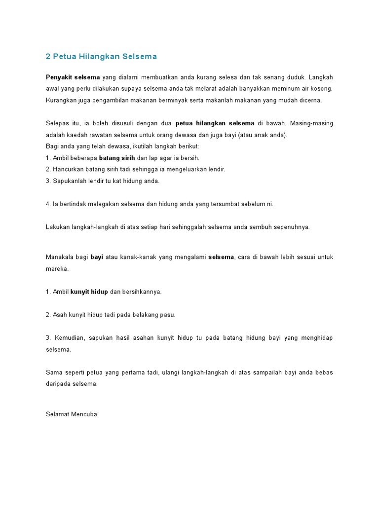 Berikut cara untuk menghilangkan jerawat di kulit secara alami: Cara menghilangkan kantung mata ini diyakini bisa mengurai cairan yang menumpuk di sekitar mata. Contact cara hilangkan selsema bayi on messenger. Melega dan bantu hilangkan selsema sepantas 15 minit secara purata. Elema adalah viru berjangkit yang ering menyerang pada muim ejuk.