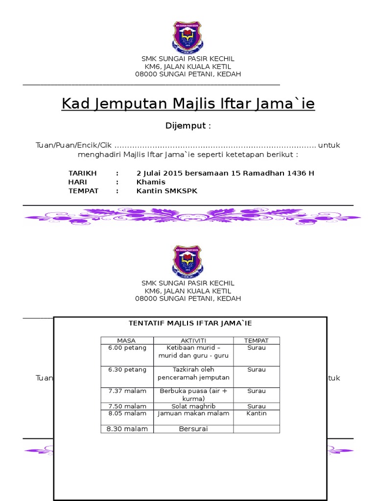 Kad Jemputan Majlis Iftar from imgv2-1-f.scribdassets.com Untuk memberkati majlis tersebut, maka majlis itu haruslah menepati adab dan sunnah ketika berada di dalam majlis. Majlis yg pertama kali diadakan selepas kita semua abis belajar. Cerita dan gambar di laman sesawang facebook kami. Banyak muslim percaya bahwa memberi makan orang buka puasa sebagai bentuk amal sangat bermanfaat dan yang dipraktikkan oleh nabi muhammad. Jemputan ke majlis berbuka puasa ketua setiausaha negara dan puspanita. Selesai sahaja berbuka puasa dan solat magrib, semua tetamu mahupun guru berada di penutup bagi majlis ini adalah tazkirah yang diceramah oleh seorang ustaz jemputan. Dengan saling mengucapkan selamat berbuka puasa kita senantiasa selalu menjaga tali silaturahmi supaya hubungan kekeluargaan semakin nah untuk anda yang sedang mencari ucapan selamat berbuka puasa bisa mencoba kumpulan pantun, puisi, ucapan biasa, ucapan bijak dan dp bbm ini Contoh kad jemputan majlis cikgu habibah smkis in 2019 projects.