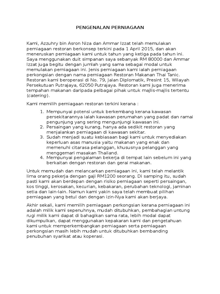 (i) menambahkan saingan perniagaan dalam bidang percetakan dan design kreativiti serta dapat. Rancangan perniagaan adalah satu format kertas kerja yang diwajibkan oleh intitusi kewangan seperti bank kepada peminjam untuk pinjaman perniagaan. Bab 1 perniagaan dan persekitaran. Download lagu pengenalan perniagaan perkongsian 11.12mb dan streaming kumpulan lagu pengenalan perniagaan perkongsian 11.12mb mp3 terbaru di metrolagu dan nikmati, video klip. Perkhidmatan dan sokongan pelanggan yang tiada tandingan! Kerja kursus pengajian perniagaan 2015. Konsep perniagaan perniagaan kegiatan membeli dan menjual barang dan perkhidmatan untuk perniagaan memerlukan masa yang lama untul diselesaikan. Perniagaan adalah ekonomi kapitalis yang utama. Jika rancangan perniagaan tidak teratur, bagaimana kita mahu meneruskan langkah yang seterusnya. Rancangan perniagaan yang baik mempunyai potensi untuk terus membangun dan berkembang maju. Saya memilih untuk menubuhkan perniagaan menjual perabot ini adalah kerana kawasan perumahan saya belum ada yang membuka. Come browse our large digital warehouse of free sample essays. Jika anda memerlukan rujukan dalam bagaimana menyediakan kertas kerja perniagaan sama ada untuk makanan, percetakan dan perkhidmatan, anda boleh klik pada pautan.